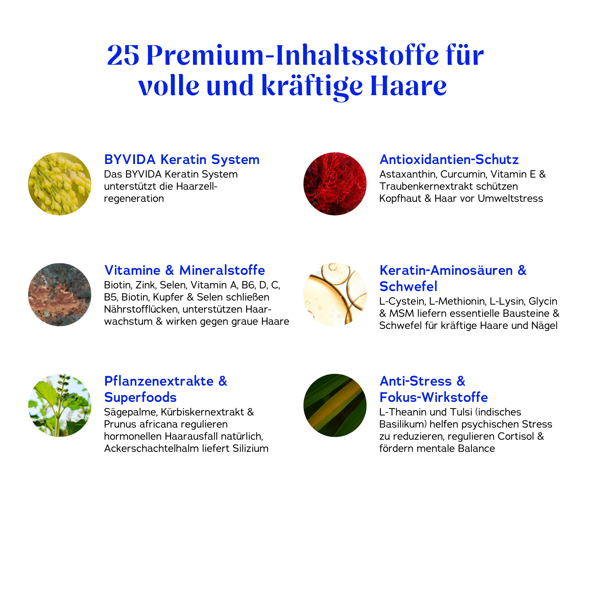 Die Unterstützung der Haare von innen heraus wird angestrebt, indem Biotin und Zink zur gesunden Haarpflege beitragen, Adaptogene wie Tulsi fördern Gleichgewicht und Ruhe im Körper, Kurkuma bekämpft Entzündungen und Astaxanthin liefert polyphenolreiche Antioxidantien, um die Zellen gesund zu halten. Durch die Kombination dieser kraftvollen Inhaltsstoffe wird die Gesundheit und das Wachstum der Haare ganzheitlich verbessert. Außerdem enthält es unser power ingredient BYVIDA Keratin System, welches direkt an der dermal papilla, der Haarwurzel wirkt.